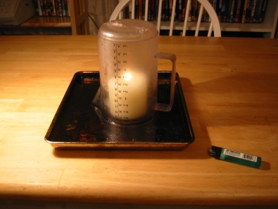 After cooling, the plastic wrap collapses. Peter Dureen again: The second experiment is a parallel one to the candle experiment. I and an associate made a little stand from aluminum foil, so that it could support a piece of burning charcoal. This little stand basically replaces the candle in the burning candle experiment. We had a shallow reservoir of water in a pan, the water surrounding the little stand. I took a piece of charcoal, which I had fetched earlier from my fireplace, and took a propane torch to all sides of it to ensure it was well lit, and then placed it on the stand. My accomplice then quickly placed a jar over the assembly. Remarkably, water eventually rose in the jar after the apparatus had a chance to cool down. It, in fact rose to precisely the same level as it had in a candle experiment using the same jar. So it seems that charcoal has the same effect as a candle. Now in your analysis, you mention that the candle burns hydrogen, and produces water, and that seemed quite reasonable to me at the time. But after conducting this experiment, I must ask why burning carbon alone should produce precisely the same result. It is hard for me to explain to my students these two experiments. I now await further discussion of this matter, and hopefully, an analysis that explains the results of these recent experiments.I think this is more indication that some hot air has left the container before it started to cool down. I have repeated the experiments also with different type of containers and seen also some air, as other teachers have observed too. I thank you for posting your explanation. I hope the above adds something to the discussion. Maybe we should consult Faraday. Did he not write something called the history of the candle?Faraday had been a fantastic experimenter and assisted as a chemist before for a long time. Lavoisier was definitely a great pioneer in this context. |