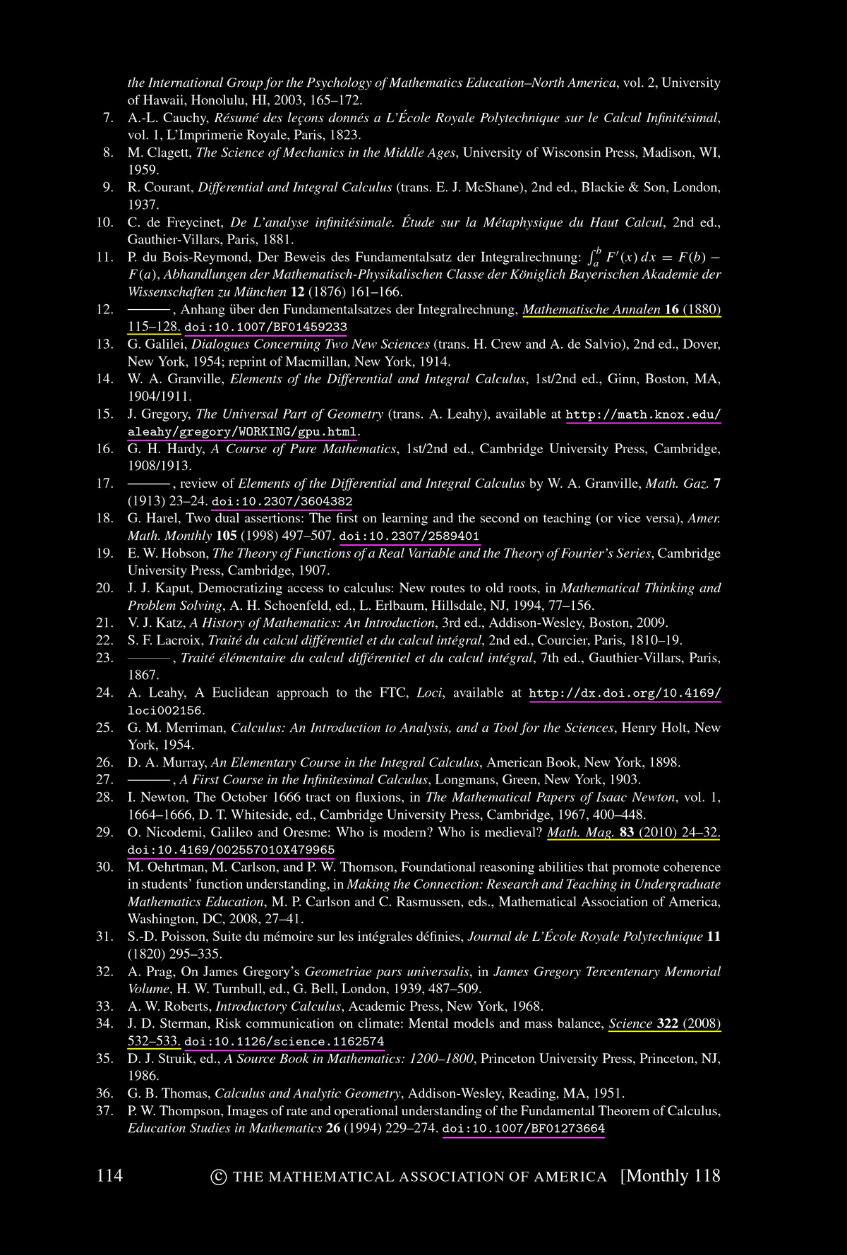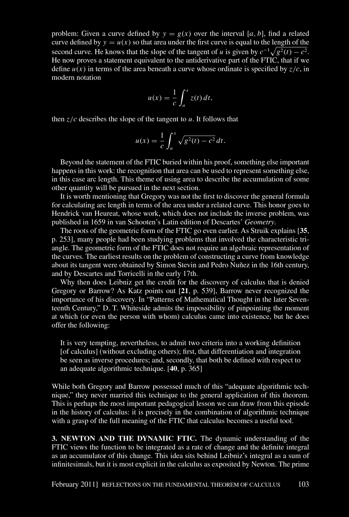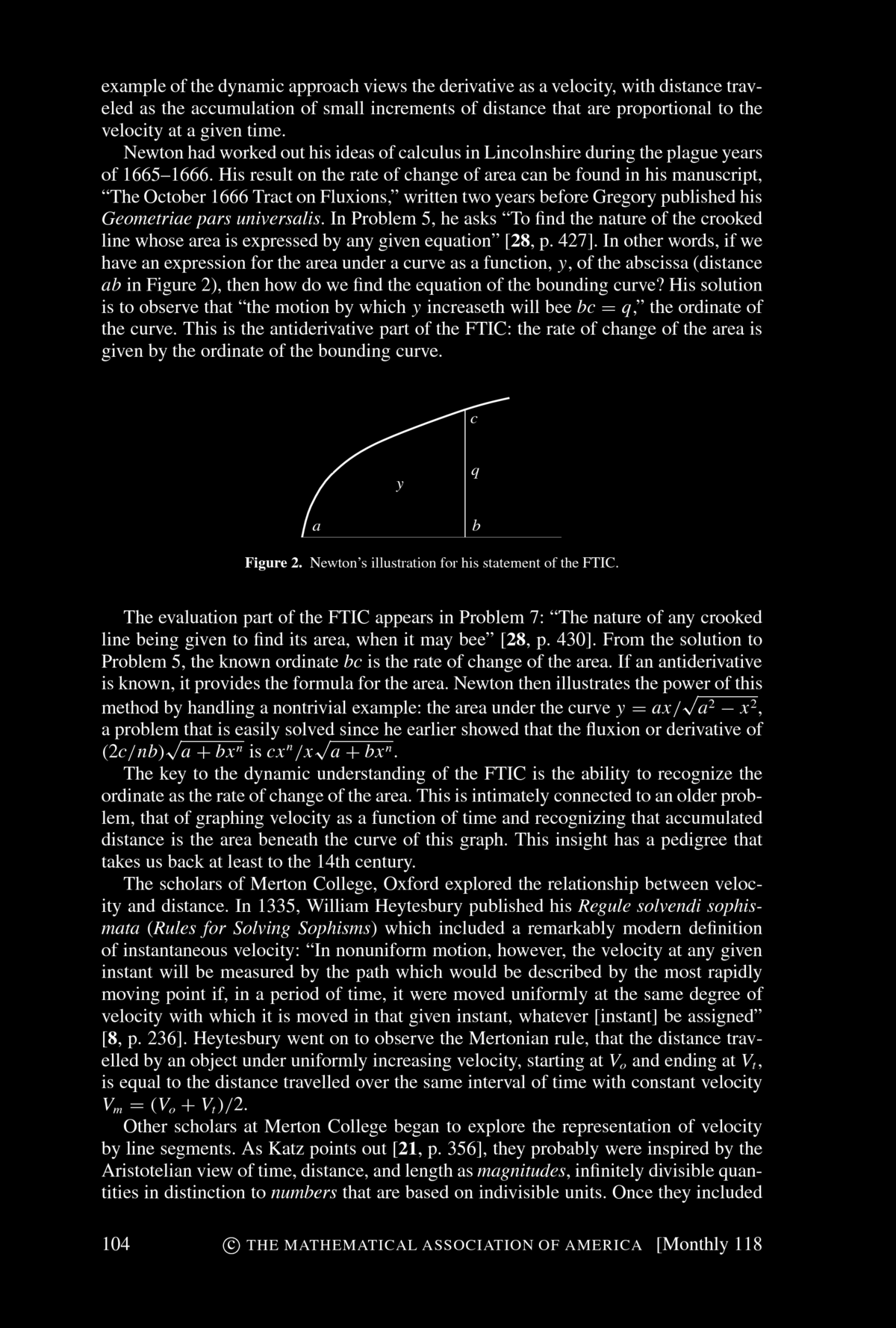 Patrick Thompson, Marilyn Carlson, and others have explored the pedagogical obstacles that students must overcome before they can comprehend the dynamic FTIC. The very first step is to understand functions as descriptions of covarying relationships. Most students think of functions as static objects, either algebraic expressions--in Thompson's words, as "a short expression on the left and a long expression on the right, separated by an equal sign" --or as the geometric object that is the graph of the function. We can not expect students to comprehend the dynamic view of the FTIC unless they are able to see functions as describing a dynamic relationship between covarying quantities. Understanding covariation is only the first step toward the FTIC. Next comes accumulation. We would do well to require our students to formulate their own explanations of the Mertonian rule. Accumulation is hard. A recent article in Science describes a survey of graduate students at MIT, students with undergraduate degrees in economics or the sciences and thus who had studied calculus, who were asked to explain the behavior of an accumulation function when a nonconstant rate of accumulation was specified. Even these students had difficulty with this task. The next step is to consider the rate of change of the accumulation function. Rate of change is already a difficult concept. Compounding this with an accumulator makes it all the more difficult. But once all of these pieces are in place and are understood, the FTIC is virtually self-evident. Newton never proves it. He simply observes that, of course, the rate of change of the accumulated quantity is the rate at which that quantity is accumulating. Calculus emerges from the awareness of the power of this observation.