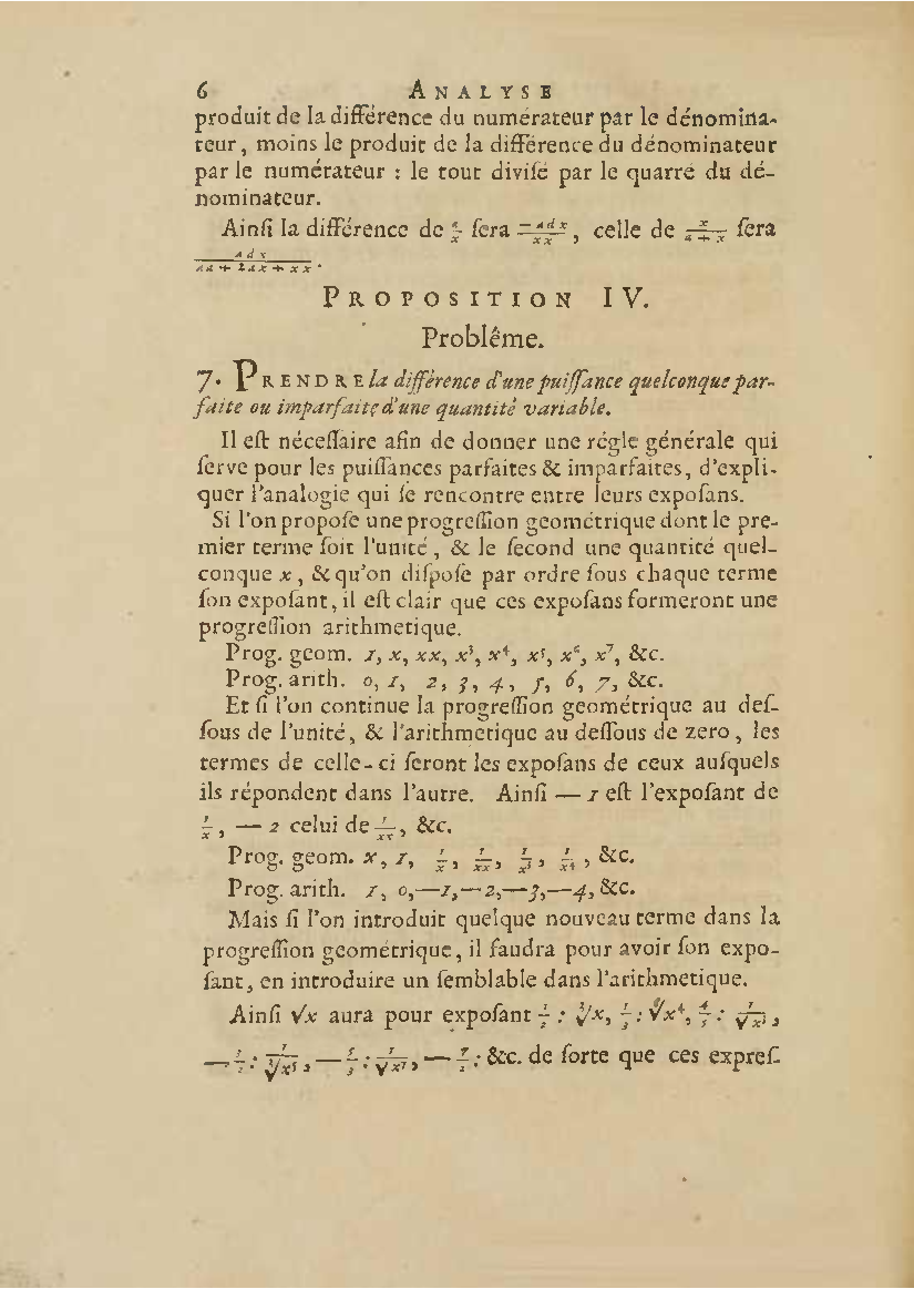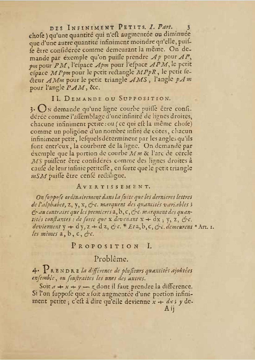 Analyse des infiniment petits, pour l'intelligence des lignes courbes Par Mr le Marquis de L'Hospital. L'analyse qu'on explique dans cet ouvrage, suppose la commune; mais elle en effort differente. L'analyse ordinaire ne traite que des grandeurs finies : celle-ci penetre jusque dans l'infini meme. Elle compare les differences infiniment petites des grandeurs finies; uelle decouvre les rapports de ces differences et par la elle fait connoitre ceux des grandeurs finies, qui comparers avec ccs infinimeurs petits font comme aucanc d'infinis. On peut meme dire que dire que cette Analyse s'etend au-dela de l'infini: car elle ne se borne pas aux differences infiniment pecites ; mais elle decouvre les rapporcts des differences de ces differences, ceux encore des differences troisiemes, quatriemes et ainsi de suite, sans trouver jamais de terme qui qui puisse arreter. De forte qu elle n'embrasse pas seulement l'infini; mais l'infini de l'infini, ou donc infinite d'infinis. PDF (I removed some empty pages from the source). |
