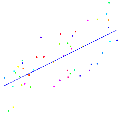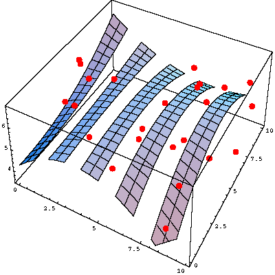 | We can also fit data (x1,y1,z1), ..., (xm,ym,zm)in three dimensions by functions z=f(x,y) = a1 f1(x,y) + ... + an fn(x,y) or implicitly by surfaces g(x,y,z) = 0 like for example g(x,y,z) = a1x2 + a2 y2 + a3 z2 + a4, in which case one would want to find the best ellipsoid centered at the origin which fits the three dimensional data. |