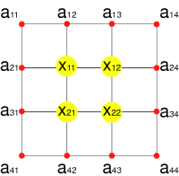 x11=a21+a12+x21+x12 x12=x11+x13+x22+x22 x21=x31+x11+x22+a43 x22=x12+x21+a43+a34 |