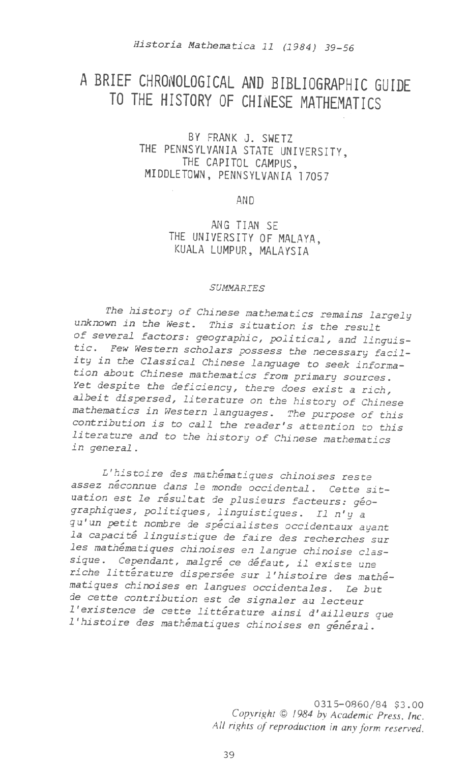 the History of Chinese Mathematics", by Frank J. Swetz,