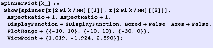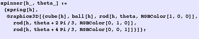 Here is an example, on how one can build a more elaborate program which shows the motion of a spinner. The following code is more to illstruate how one can make relatively quickly animations of systems in a computer algebra system. It produces a movie. Run it, grab the bracket of the result and chose under the above Cell menu the entry "Animate selected graphics". It will show you how the system moves.