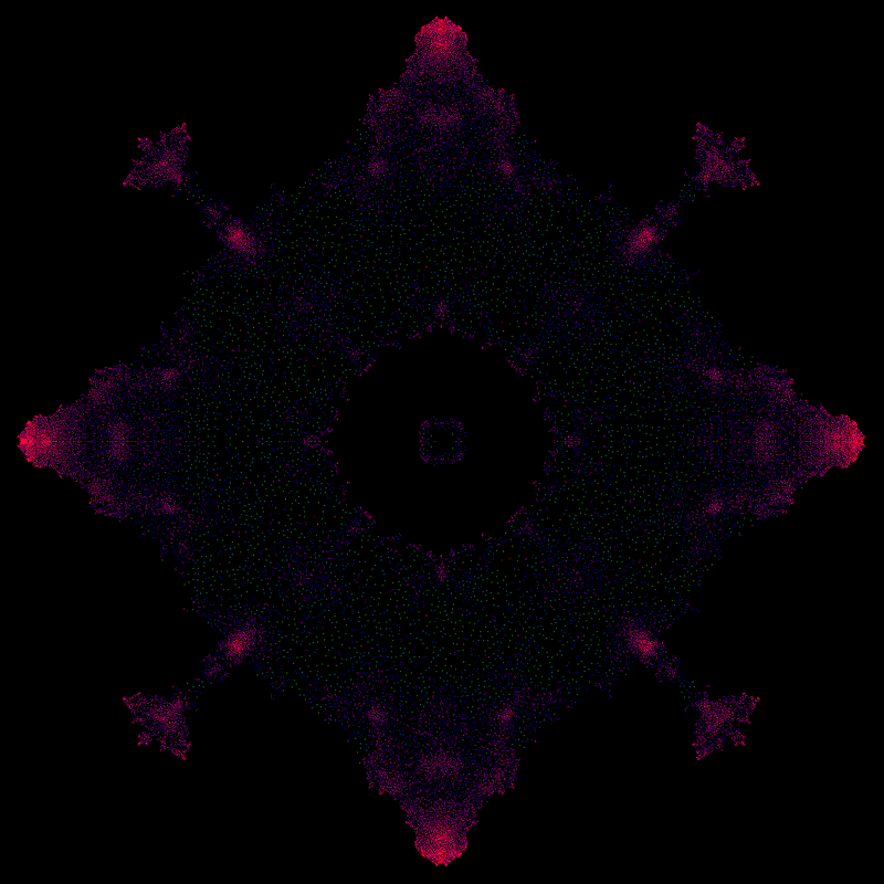 more boring. Each point is an eigenvalue. When the parameter changes in the probability space, the eigenvalues move like a swarm of 2000 particles, fighting each other under a changing external force. Eigenvalues "fear" each other. Since each eigenvalue is a hero "battling" in the complex plane, a heroic music theme has been chosen. More about this in the Mathematica project. Added October 17: the spectra seen here are expected to have a fractal structure if the matrix size goes to infinity. It was Mandelbrot, who just died who had popularized the subject of fractals. Mandelbrot had lived at 75 Cambridge street in Cambridge (pretty close to the Science museum). He had been a visiting professor at the Harvard mathematics department. Added October 31: here is a picture of the spectrum of a 30'000 x 30'000 matrix computed on Odyssee. |
