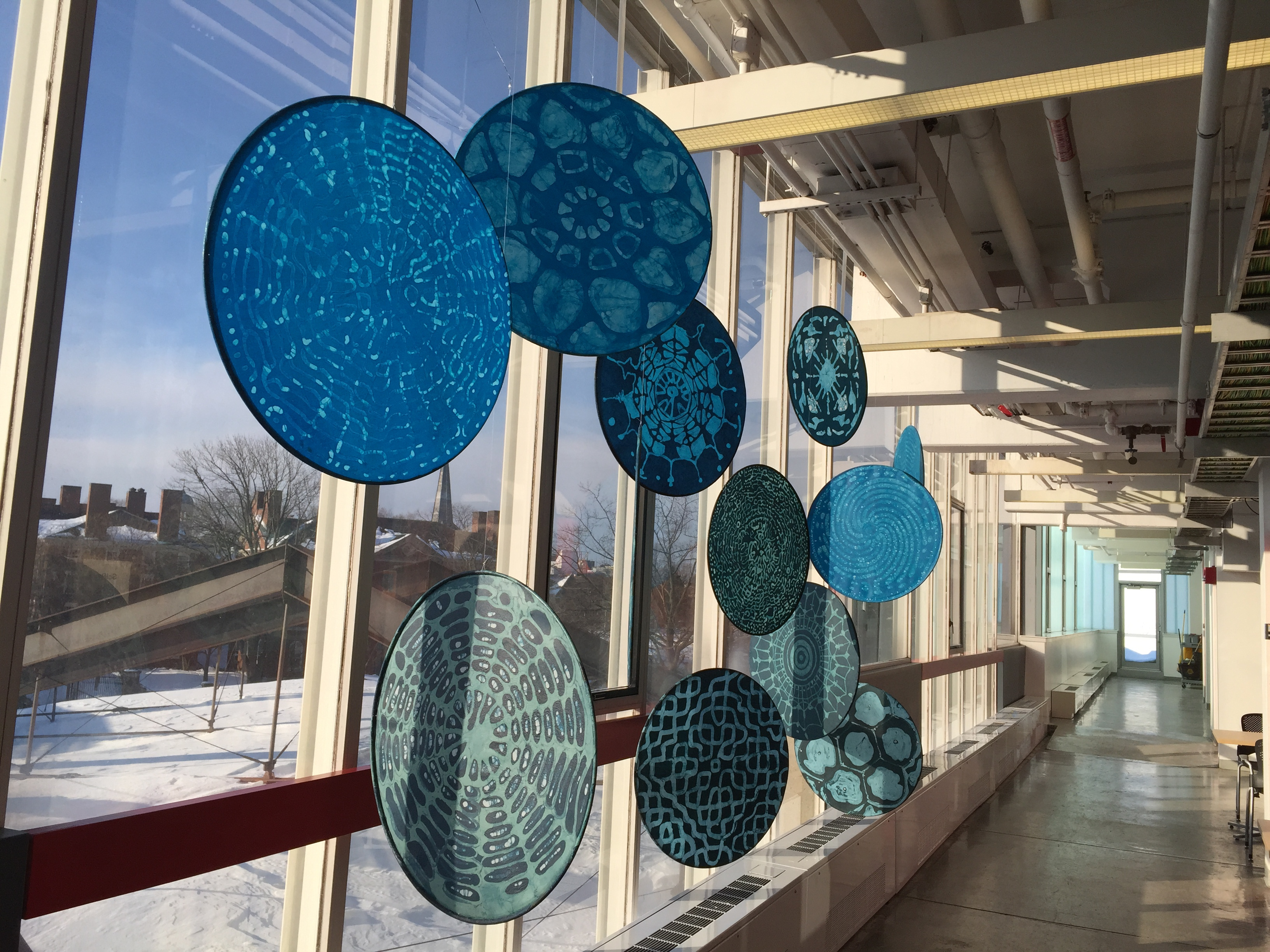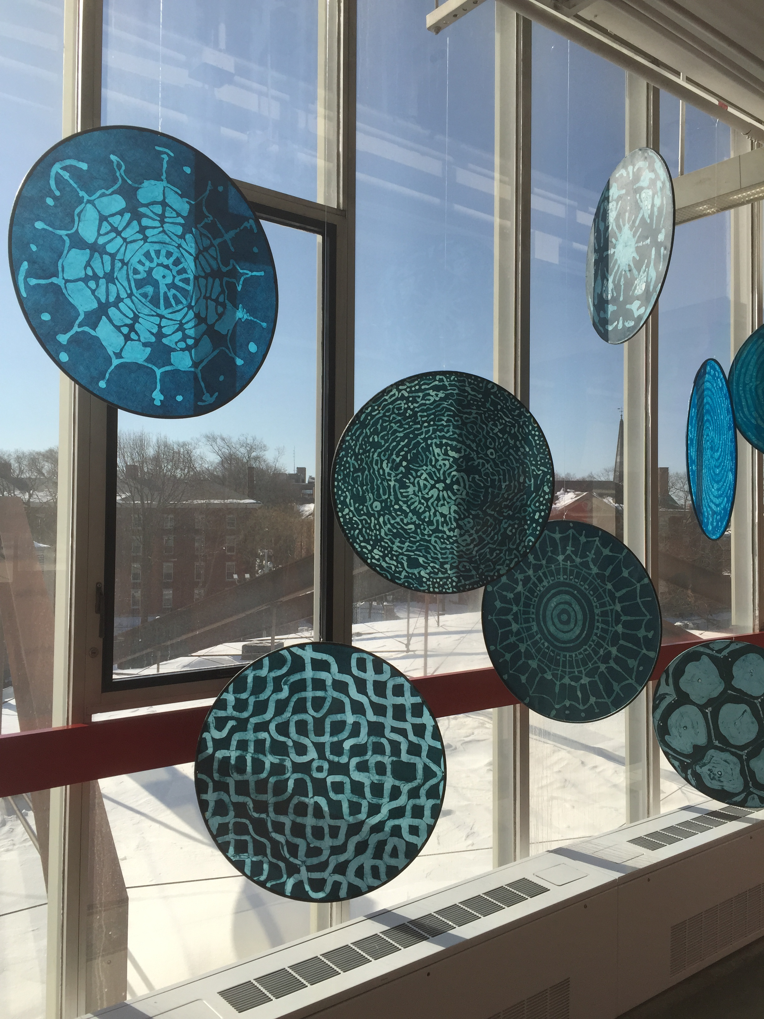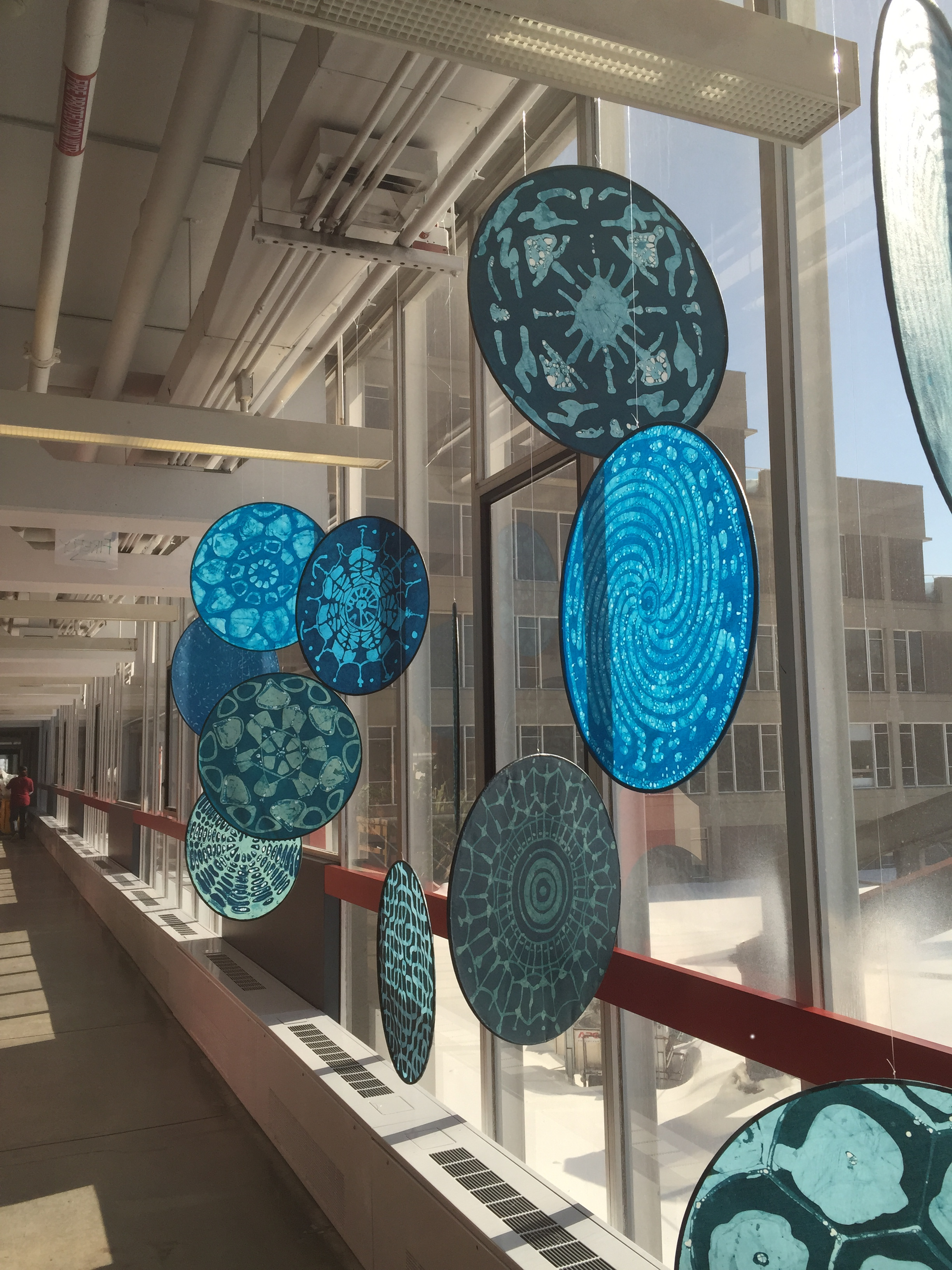 as seen in the third floor of the science center in February 2015. These Chladni type figures were done by the artist. In physics, they are eigenfunctions of the Laplace operator.