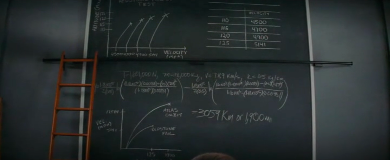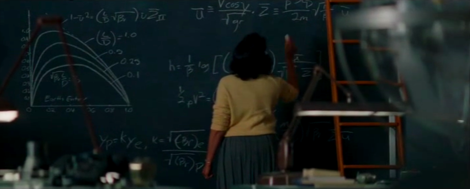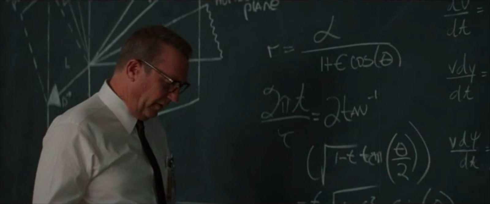 to solve differential equations. The blackboard of Al Harrison (played by Kevin Costner) features equations of conic sections like ellipses given in polar coordinates as r = α/(1+ε cos(θ))The problem of finding the trajectories of a rocket is a problem in differential equations. One equation we can see ds/dt = vr, dvr/dt = vθ2/r g(R/r)An other describes the motion in spherical coordinates (unfortunately, not all formulas are well visible): dr/dt = v sin(y) dθ/dt = v cos(y) cos(ψ)/(r cos(φ)) dφ/dt = v cos(y) sin(ψ)/r dv/dt = (1/m) Fr - g sin(y) v dy/dt = (1/m) Fm cos(y) -g cos(y) + (v2/r) cos(y) v dψ/dt = (1/m) F... sin(y) + (v2/2)They are nonlinear but we will cover some nonlinear equations also in our course. Still, the Kepler problem can actually (with some clever transformation) be reduced to a Harmonic oscillator, which is a linear ODE. We see Catherine also work on some differential equations on the large blackboard. |