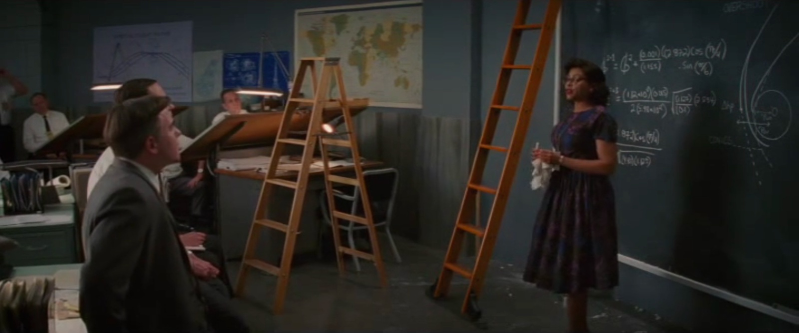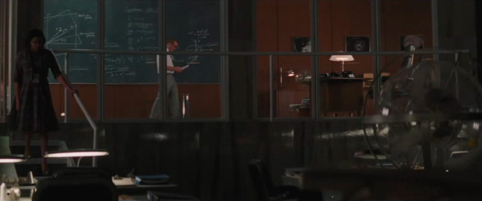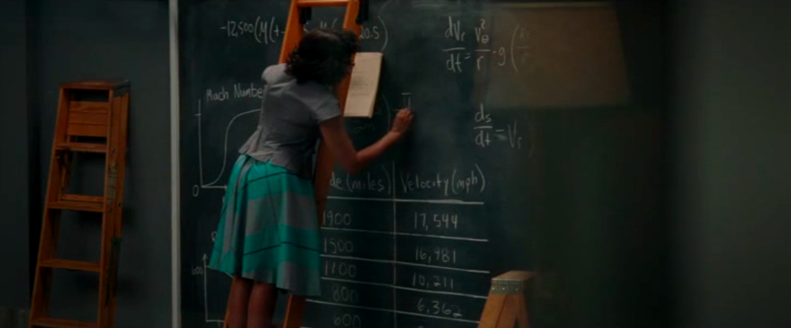 to solve differential equations. The blackboard of Al Harrison (played by Kevin Costner) features equations of conic sections like ellipses given in polar coordinates as r = α/(1+ε cos(θ))The problem of finding the trajectories of a rocket is a problem in differential equations. One equation we can see ds/dt = vr, dvr/dt = vθ2/r g(R/r)An other describes the motion in spherical coordinates (unfortunately, not all formulas are well visible): dr/dt = v sin(y) dθ/dt = v cos(y) cos(ψ)/(r cos(φ)) dφ/dt = v cos(y) sin(ψ)/r dv/dt = (1/m) Fr - g sin(y) v dy/dt = (1/m) Fm cos(y) -g cos(y) + (v2/r) cos(y) v dψ/dt = (1/m) F... sin(y) + (v2/2)They are nonlinear but we will cover some nonlinear equations also in our course. Still, the Kepler problem can actually (with some clever transformation) be reduced to a Harmonic oscillator, which is a linear ODE. We see Catherine also work on some differential equations on the large blackboard. |