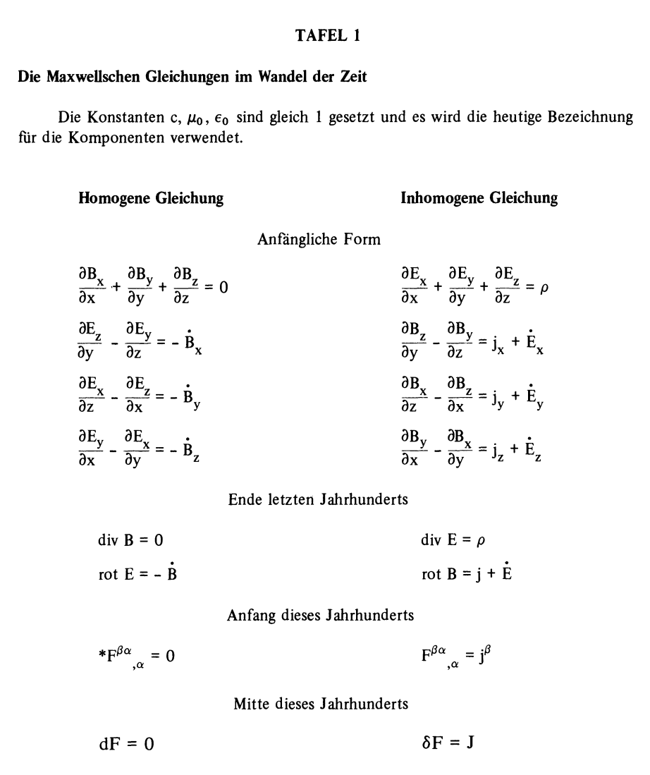 A great textbook in mathematical physics is the series of Thirring. I liked as a student especially the great summaries for each chapter (but I found the book very hard to digest). In any way, there is one great page in the second volume, which shows the evolution of the Maxwell equations. Obviously, we have learned to make things more elegant since Maxwell discovered the equations. I have only the German edition, but there is an English translation. Here is an example of such a section summary. We translate that summary:| In classical field theories, the algebra Ep of forms and their exterior derivatives play a central role. Through them as well as through the *-map Ep -> Em-p one can write down the Maxwell and Einstein equations. |