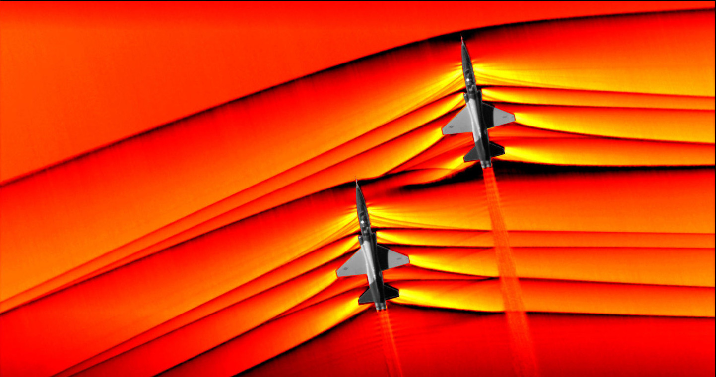 NASA captures showed some images of colliding shock waves from T-38 jets flying in formation at supersonic speeds: This is partial differential equations in action. NASA used the Schlieren photography technique to capture these interacting shockwaves.
