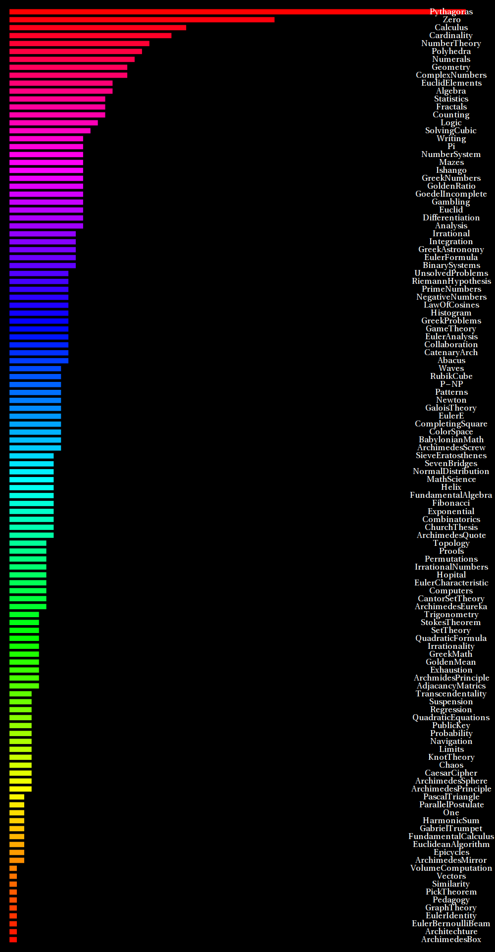 Here is the top list of topics chosen for the topic "Top 10 Moments of Mathematics" from Spring 2011 If a topic was chosen as 1. Rank by a student, it would get 11 points, if it had rank 10, it would get 1 points. We see just all points added up.