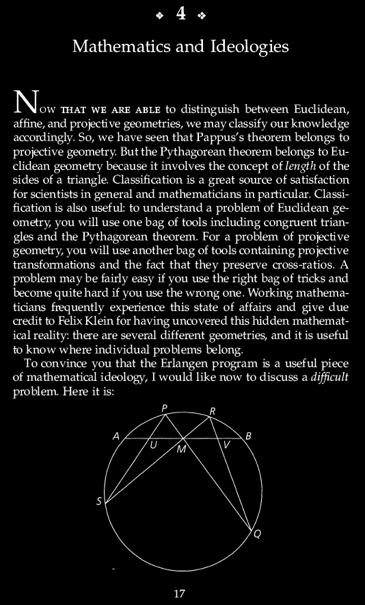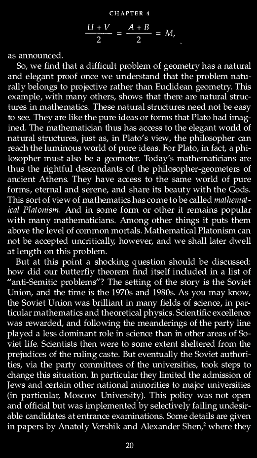history. The background music to the animation to the left is from Celtic Harp Volume IV, "O'Carolan's Dream, The Butterfly". The following pages are from the book by Ruelle. It is an interesting story since the theorem is an example of a "murdorous problems". Ruelle outlines also the proof of the theorem. Proofs are difficult to find. And it needs some knowledge in complex analysis, in particular that Moebius transformations preserve the cross ratio. Below is a proof found in Coxeter-Greitzer. We will look at this theorem in the lecture, but focus on an other aspect of it. When I was a astudent at ETH, I have had Ruelle as a professor in a "Nachdimplom Vorlesung" (=graduate course) on zeta functions in dynamical systems. Ruelle is famous in particular his mathematical work on Chaos theory. Ruelle and Takens coined the term "Strange attractor". Chaos theory knows the Butterfly effect: "Does the flap of a butterfly's wings in Brazil set off a tornado in Texas?" Butterflies appear also in other places of mathematics. An example is the Hofstadter butterfly. |