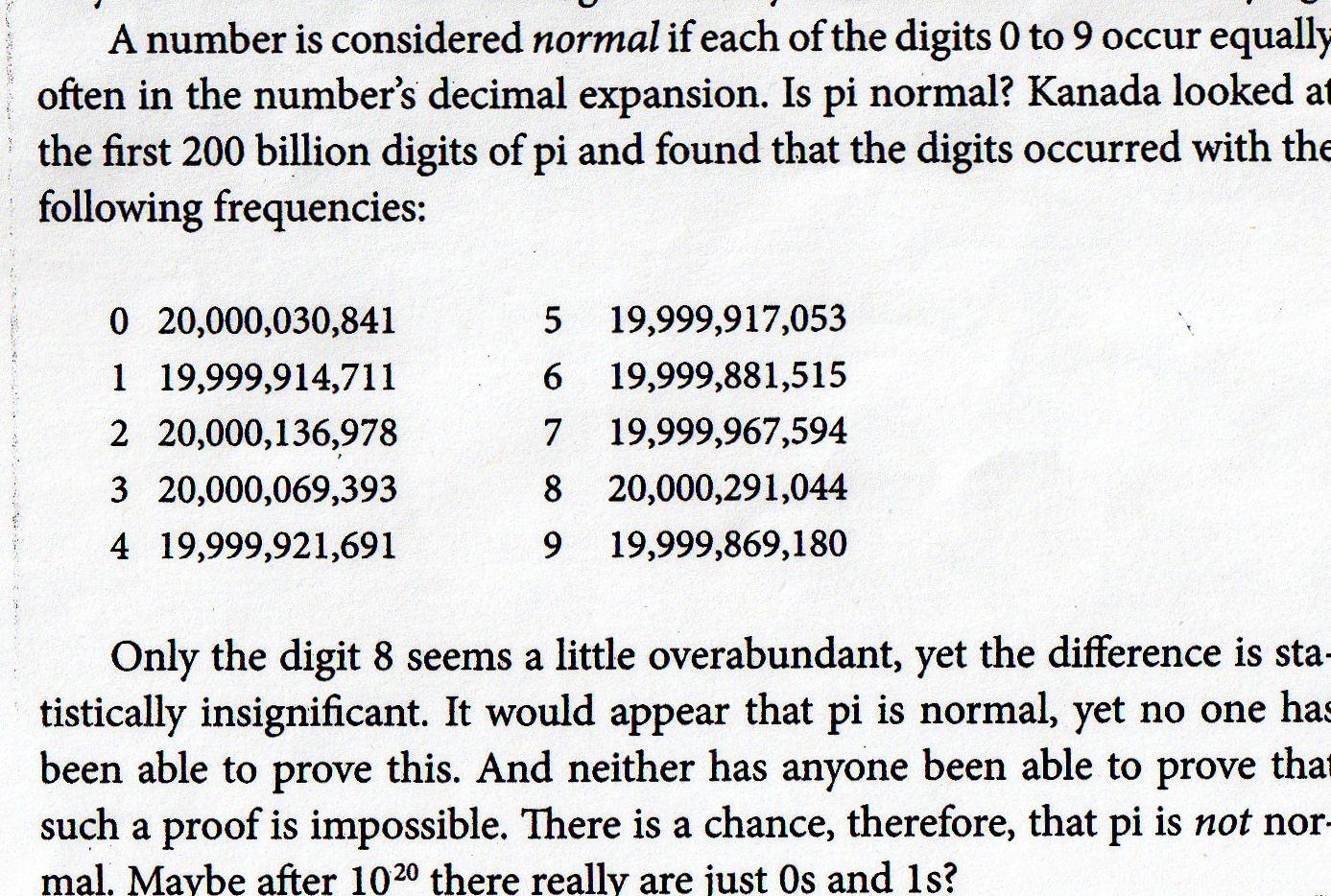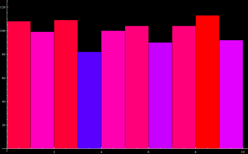 of the first 1000 digits of sqrt(2): F[n_]:=Histogram[IntegerDigits[Floor[(10^n) N[Sqrt[2],n]],10]]; F[1000]Nobody knows whether the statistics will eventually flatten out. Everybody believes, it will. |