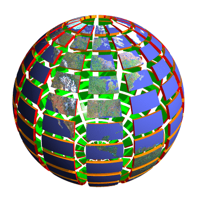 The animation shows the earth surface sliced into spherical wedges. These wedges are in the (theta,phi,rho) coordinates just cubes. The surface texture is a rectangle:
