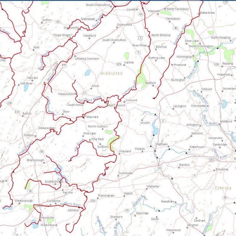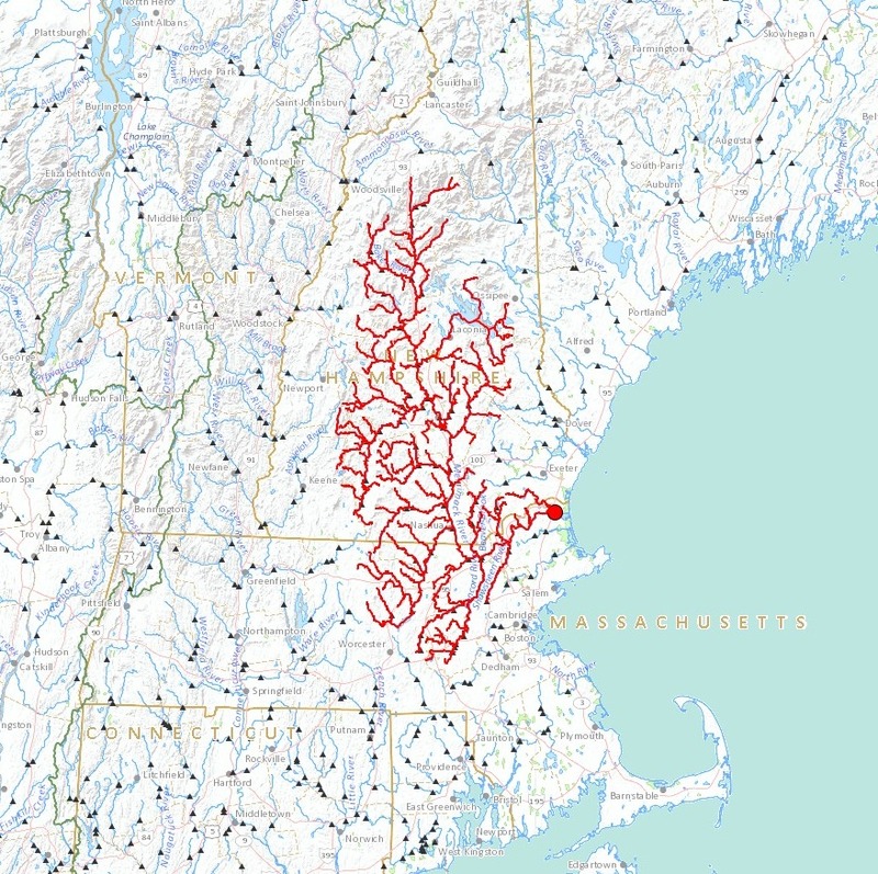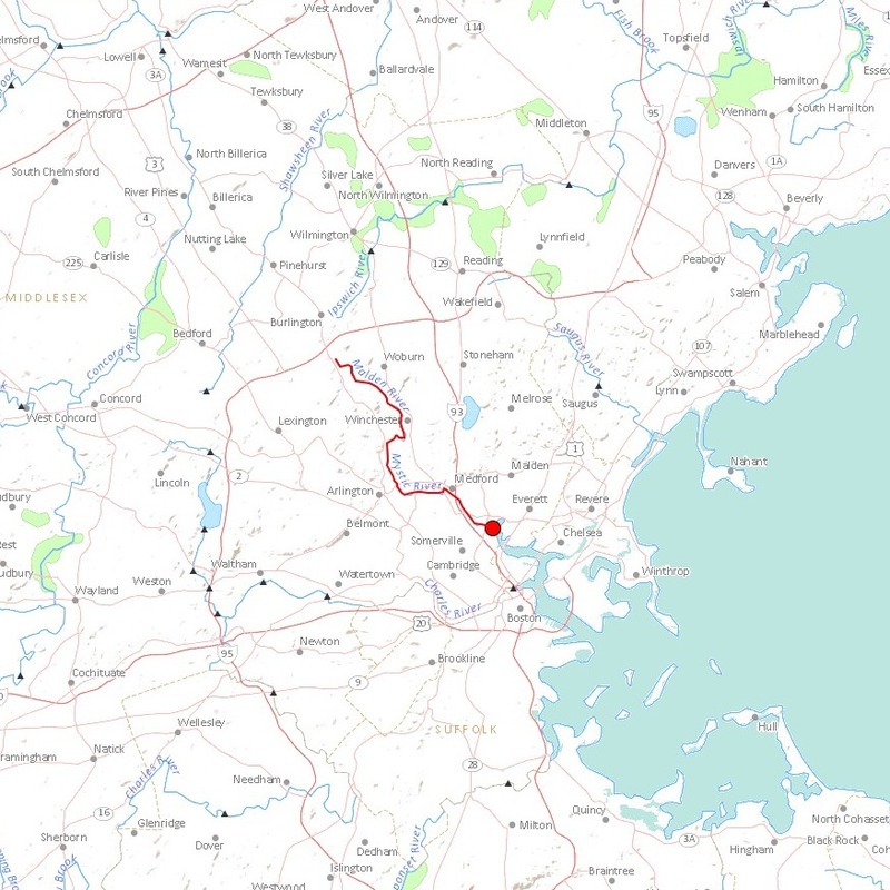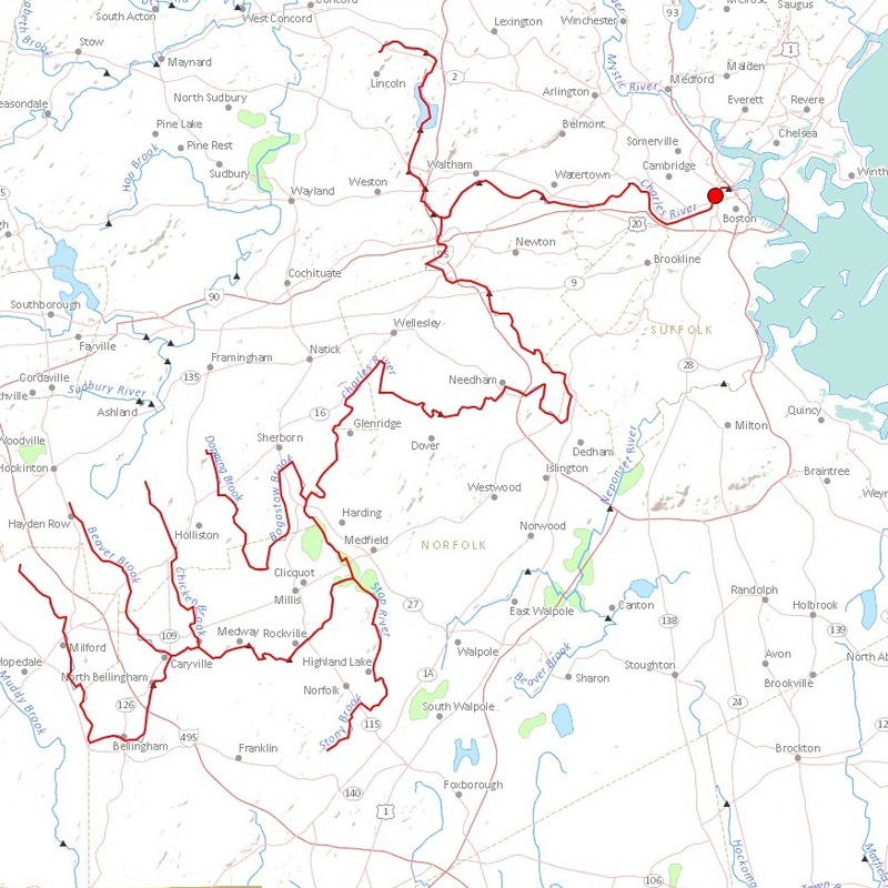 The national atlas has a cool tool, called streamer which allows to trace rivers. Try it out. Here are some upstream tracers. The tool shows interesting things: how river upstream patterns become fractal, where watersheads appear. The middlesex channel for example crossed over from the Mystic river to the Merrimack river.Charles river