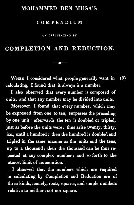 Here [PDF] is the book of Al Khwarizmi on Algebra. It starts very nicely:| "When I considered what people generally want in calculating, I found that it always is a number." |