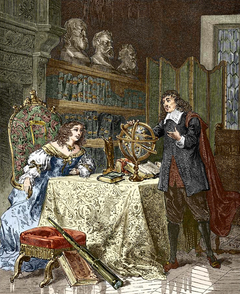 A famous picture of Pierre-Louis Dumesnil (1698-1781) repainted by Nils Forsberg in 1884 shows Descartes teaching geometry and Astronomy to Queen Christina of Sweden (1626-1689). He had to teach three times a week at 5AM. Being used to rise at 11am before, it was not long until he caught pneumonia and died in 1650.