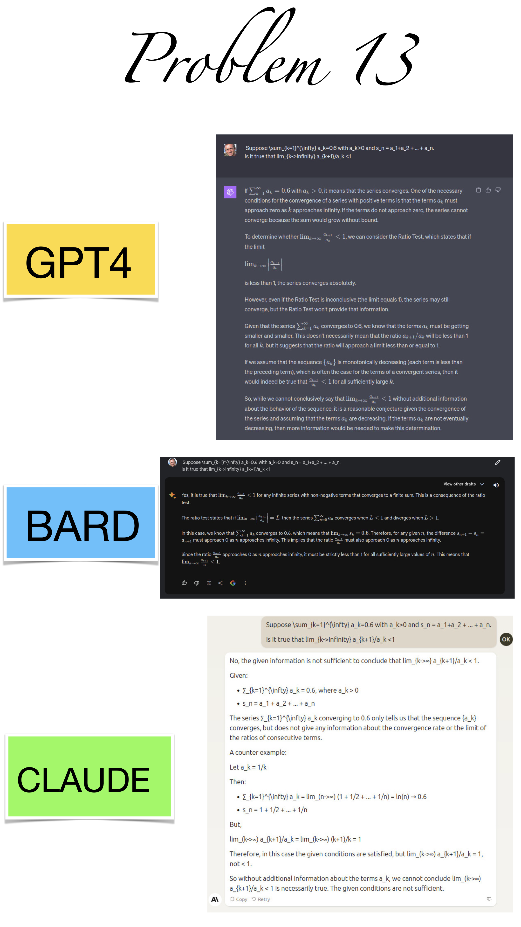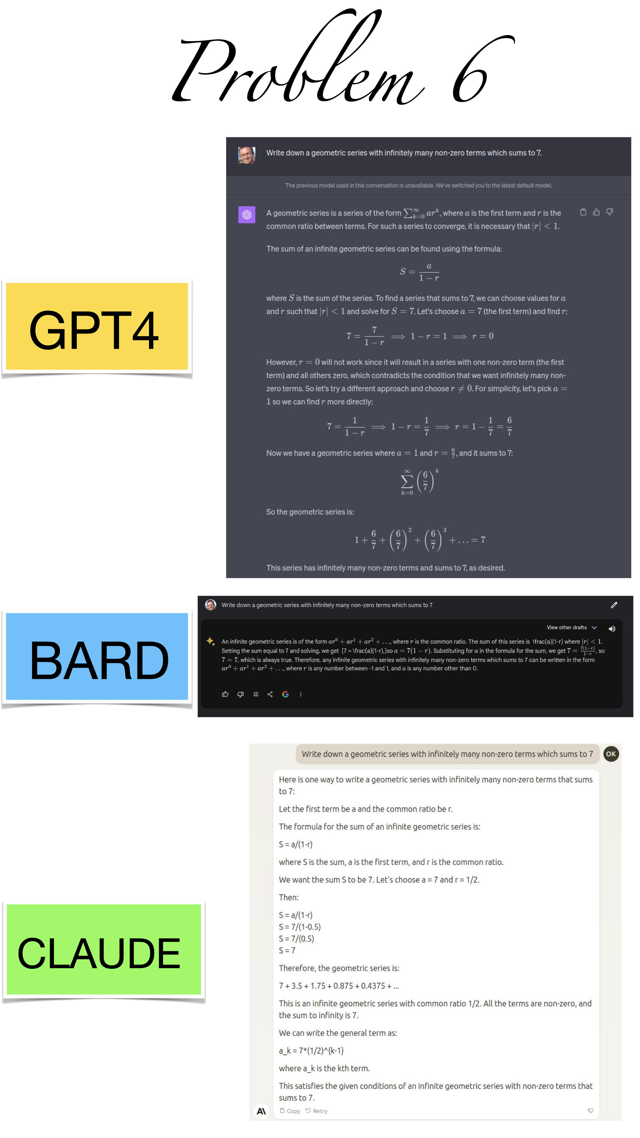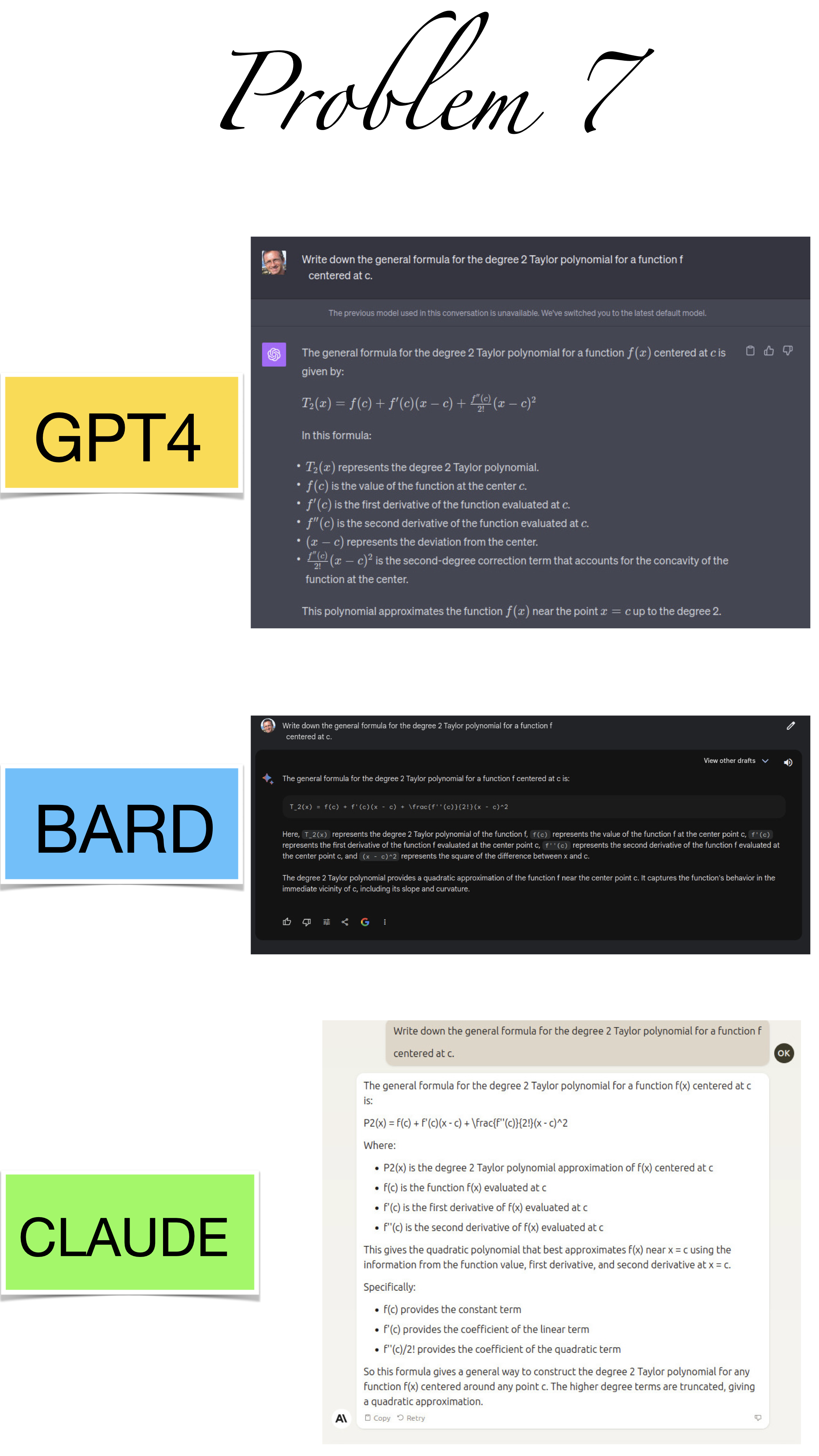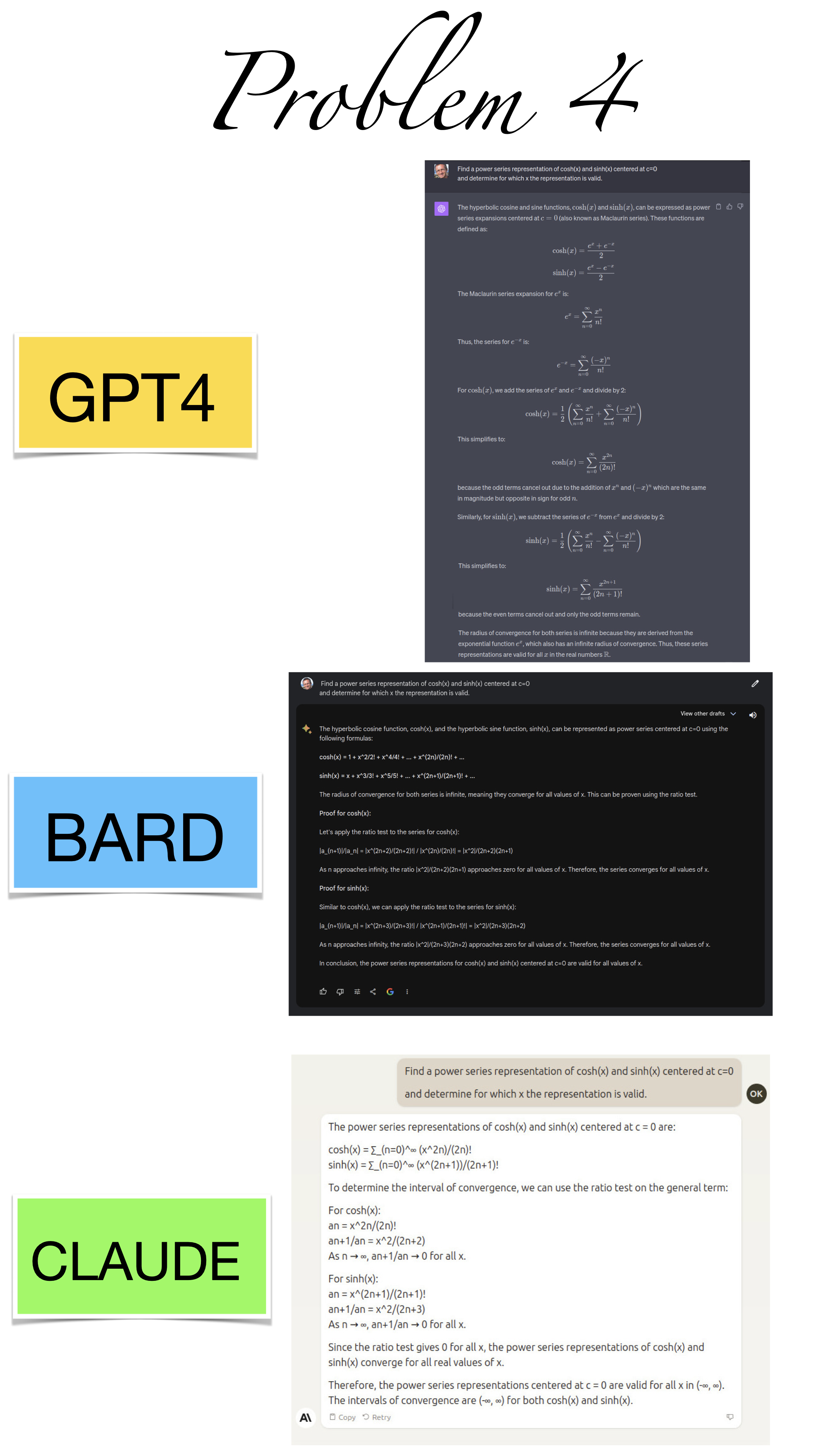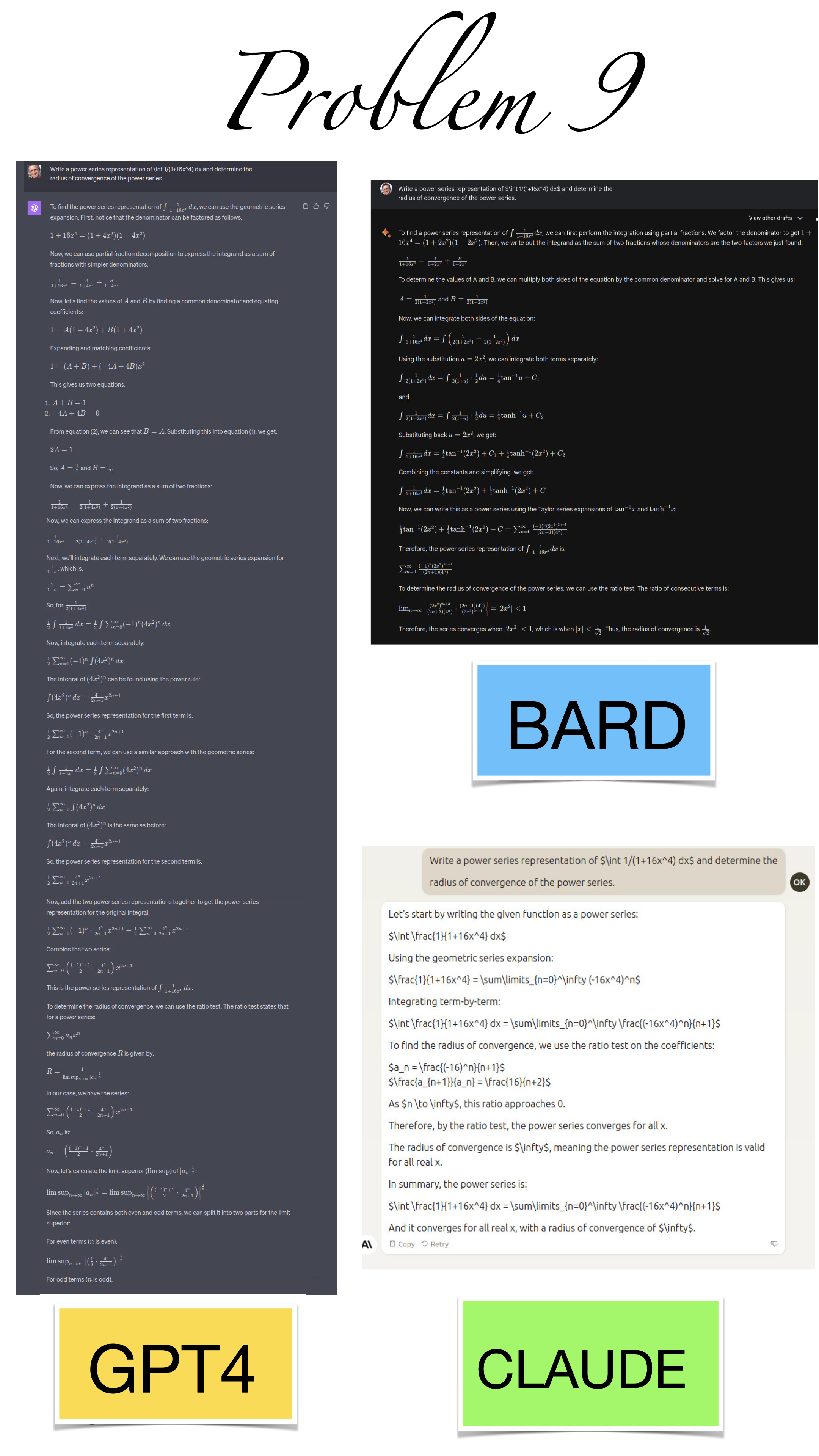 | Here are the pictures of the 1 minute short done before the second midterm in Math 1b. Three bots, GPT4, BARD, CLAUDE competed. I made a 35 frame slide show for that. The 1 minute short contains also the output captured from what the bots told. It can be inspected more closely here. Click onto a slide to see it large. |