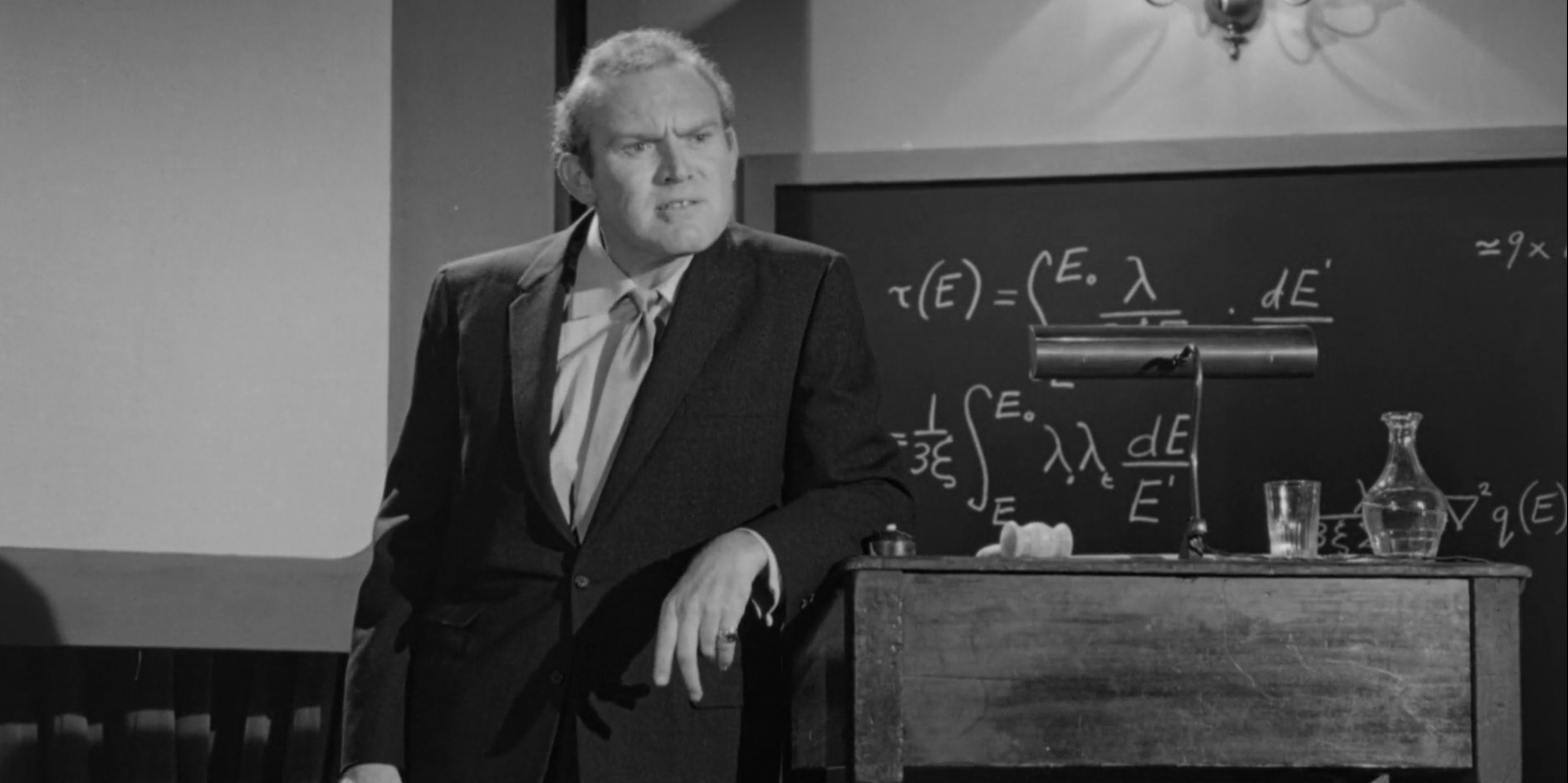 In the "Giant Behemoth", Gene Evans lectures before a blackboard with double integrals.